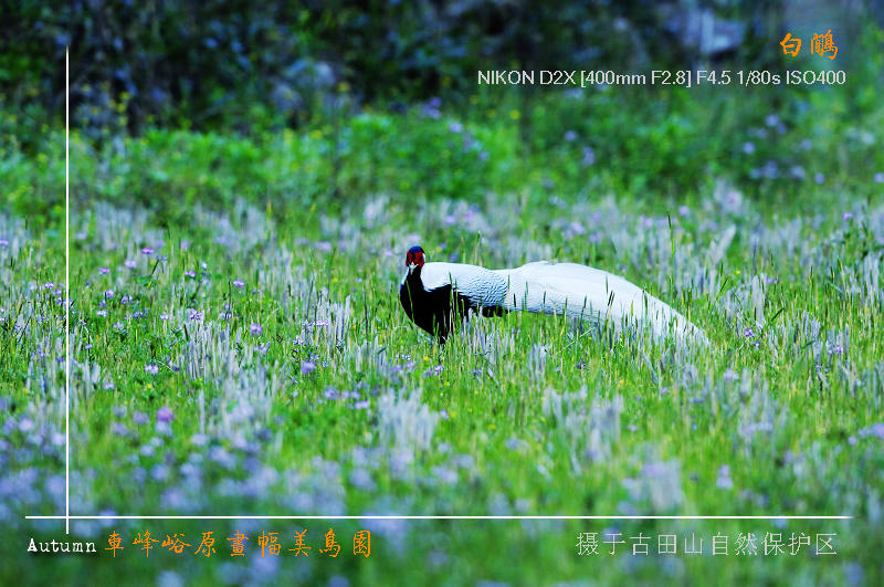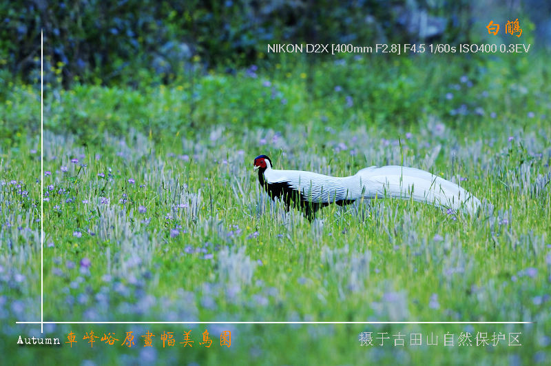 一个说明:想测试在无阳光直射的情况下,使用重点测光模式拍白黑色鸟身的合适曝光量,所以这次拍白鹇使用了加减0.3包围曝光(以前拍白鹇曾均用减0.3)。实际证明:中央重点测光时无加减曝光量正好。