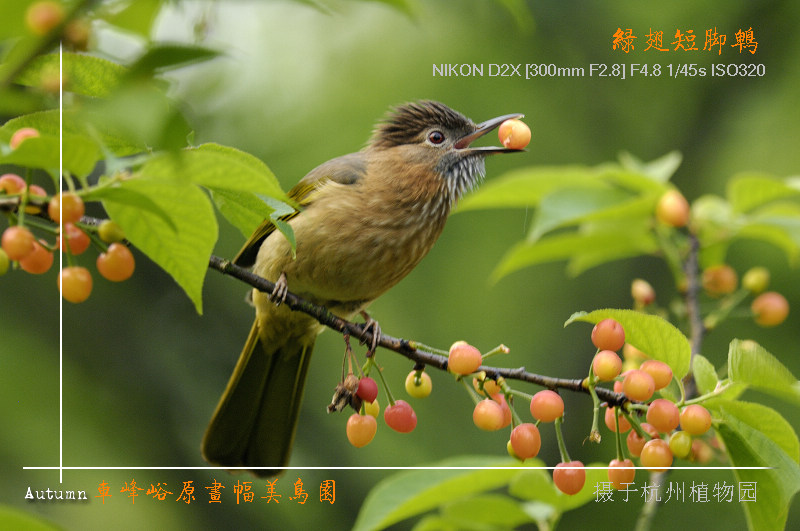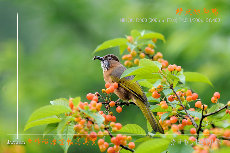 一年一度的鸟人涌入杭州植物园拍“樱桃版鹎鸟”于上周“拉开帏幕”。听说拍鸟场面人多时,同时竖起逾17门大小炮。我因是利用早晚时间去的,快门上不去,所以只能拍拍呆呆鸟啦。。。呵呵!