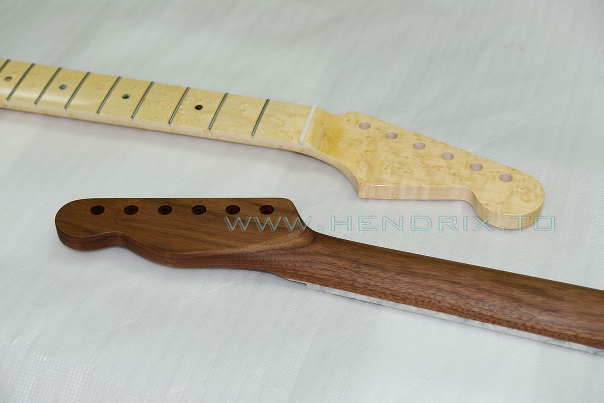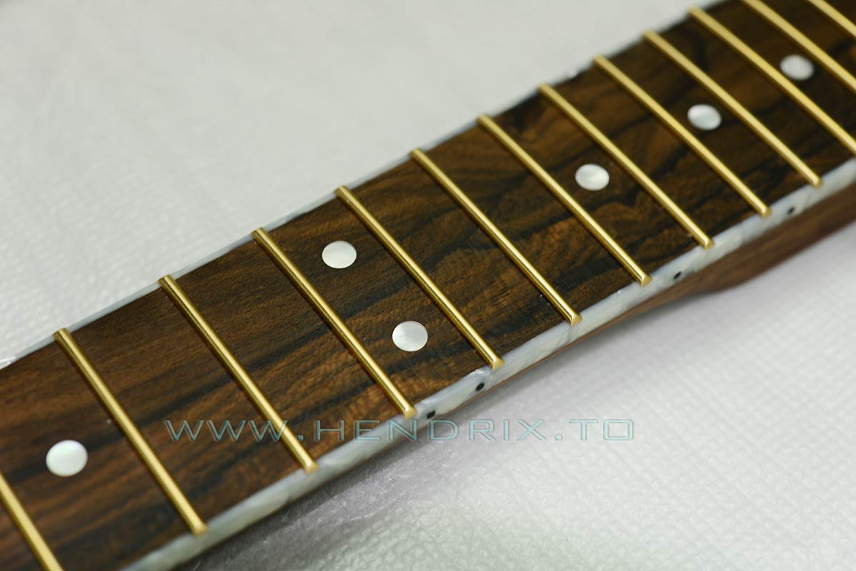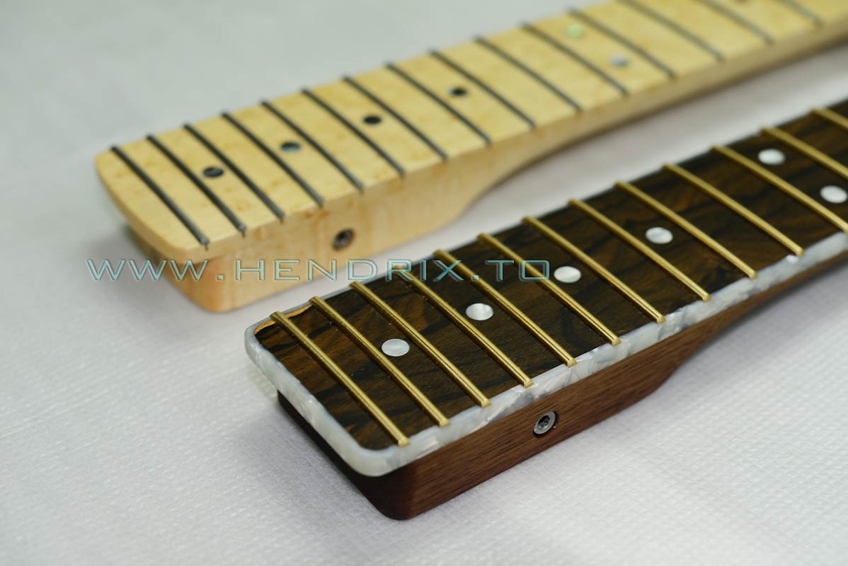 這枝 tele 的頸是 Walnut,主木加 Ziricote Fretboard 指板,第一次用這種木,看看效果如何 ....... 貪花悄用了金色copper alloy frets