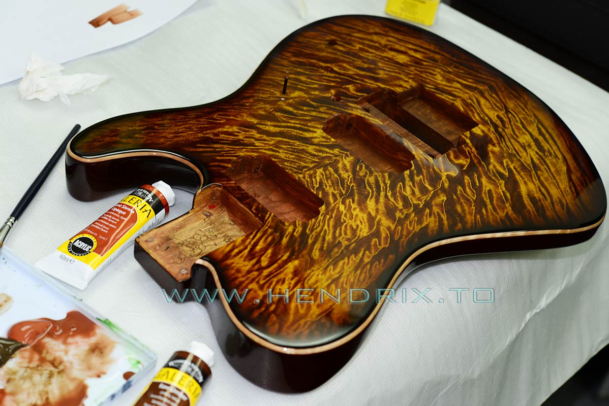 在防潮箱開到抽濕力最高,抽乾了一段時間後,把新鑼出暴露出本身的木紋的地方,上色,以來整體顏色合諧,二來重要的是吧能再受潮的地方封閉,保持木材的清脆乾燥。