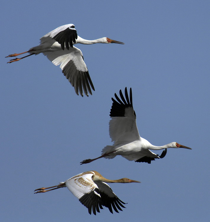 描述:体大(135厘米)的白色鹤。嘴橘黄,脸上裸皮猩红,腿粉红。飞行时黑色的初级飞羽明显。幼鸟金棕色。