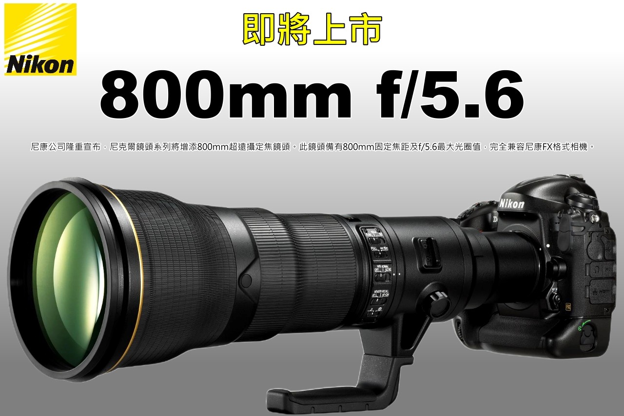 尼康公司为尼克尔镜头产品线新增一款800mm超远摄定焦镜头。该镜头的固定焦距为800mm,最大光圈f/5.6,兼容尼康FX格式相机。