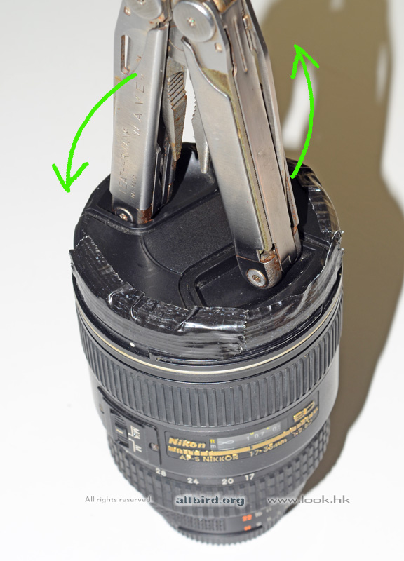 用鏡頭蓋來施力來扭 filter 最好就是頂端有兩個手指位的凹位,用鉗的柄放落凹位內就用到力來扭啦,當時都不是易,強力膠布由於黏的面積小,都扭一次脫落,再貼再扭,搞了三次才 OK .
